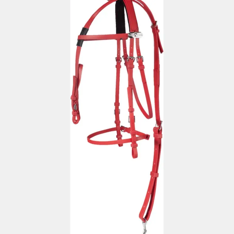 La têtière de la bride est doublée pour plus de confort et permet le passage de l’enrênement. L’enrênement de course est composé d’une partie en Y descendant le long du chanfrein du cheval pour se fixer de chaque côté du mors. La lanière ajustable qui court le long de l’encolure du cheval se fixe à la sellette par un mousqueton et peut être réglée en deux endroits pour garder la tête du cheval plus ou moins relevée selon le souhait du driver.
