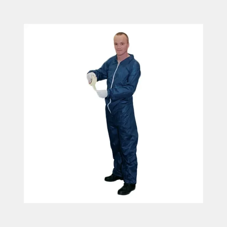 Combinaison à usage unique en polypropylène de couleur bleue. Fermeture à glissière. Elastique aux poignets, chevilles, taille.