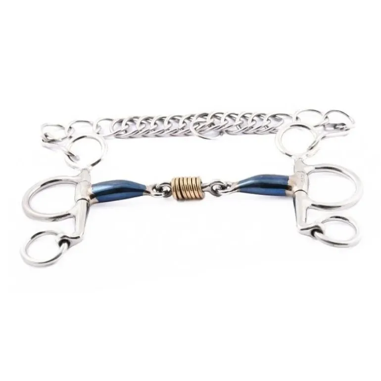 Mors Pelham petites branches 45 mm, canon de 16 mm en Blue Steel et anneaux 100% cuivre. L’alliage Blue Steel qui recouvre cette gamme de mors Jump’In est composé de 54% de carbone et 46% de manganèse. Les mors Blue Steel s’oxydent au contact de l’air et de l’humidité. Il apparaît alors une fine couche de rouille au goût sucré qui stimule naturellement la production de salive. En salivant plus, le cheval prend plus de contact sur son mors. Dans ce processus d’oxydation la couleur va changer en gris/brun.