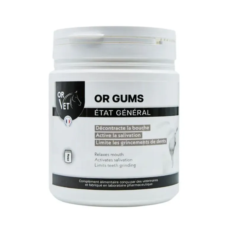 Or Gums de la marque Or Vet est un complément alimentaire pour chevaux qui permet d’encourager la mastication et donc permettre la décontraction de la mâchoire ainsi que la salivation. Il améliore le contact afin de favoriser une meilleure locomotion et ainsi optimiser le travail du cheval. Or Gums crée un film sur les dents qui limite les grincements.